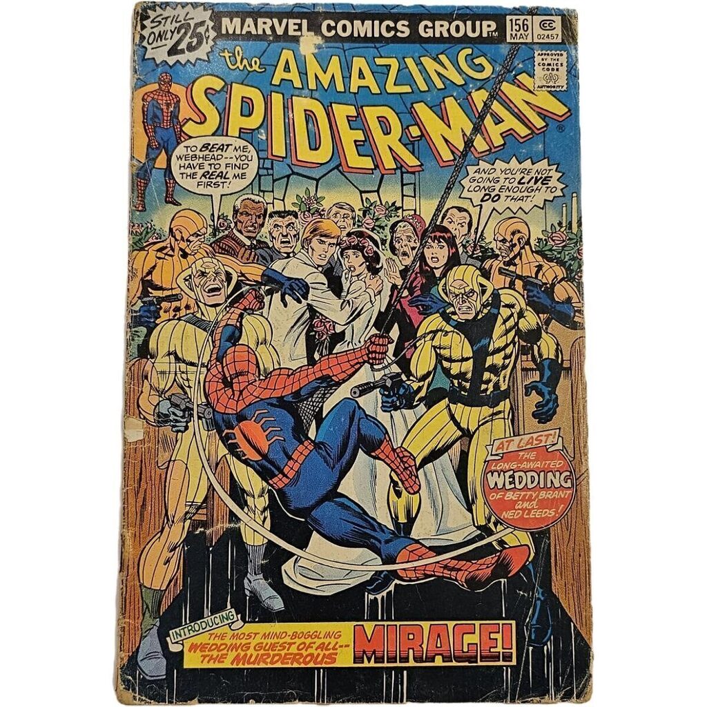 "ESTADO GOOD  ""On a Clear Day, You Can See...The Mirage!"" Script by Len Wein. Pencils by Ross Andru. Inks by Mike Esposito and Dave Hunt (backgrounds). Cover by John Romita. Wedding bells ring in the pages of the Amazing Spider-Man! As Peter's former girlfriend (Betty Brant) and the web-slinger's future foe (Ned Leeds aka the Hobgoblin) tie the knot! The joyous ceremony proceeds as planned until a wedding crasher shows up! The Mirage! And he's not just looking for free hors d'oeuvres! Can the wall-crawler see through the Mirage and restore Betty and Ned's happy day? First Appearance of the Mirage. Appearances by Aunt May, Anna Watson, Mary Jane Watson, Flash Thompson, Harry Osborn, Liz Allan, J. Jonah Jameson, Joe Robertson, and Doctor Octopus. (Notes: The Mirage appears next in Marvel Two-in-One 96. The letters page includes Marvel Value Stamp series B #83 the Incredible Hulk. This story was reprinted in Marvel Tales 133. A 30-cent cover price variant exists for this issue.) 36 pages   Published May 1976 by Marvel."